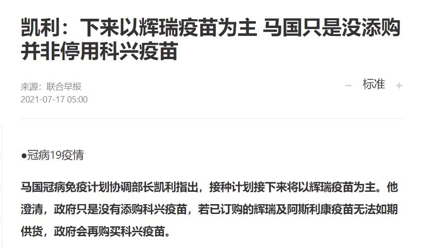 经查证,以上传言最早见于去年7月。去年7月17日,新加坡《联合早报》报道,马来西亚卫生部长凯里·嘉马鲁丁(Khairy Jamaluddin)在线上记者会上澄清,马来西亚下一阶段的疫苗接种计划将以辉瑞为主,其主要原因是马政府此前订购的科兴疫苗已经全数安排施打并即将用完,政府只是没有复购,而并非外界所揣测的,因所谓“科兴无法如期交货”,或“科兴有效性问题”而停用科兴疫苗。凯里还指出,若后续已经订购的辉瑞和阿斯利康疫苗出现供应问题,马政府将会复购科兴疫苗。