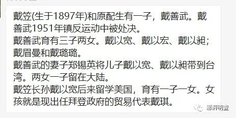 中文社交媒体上流传的一则消息称,戴琪是国民政府军事委员会调查统计局(军统)首脑戴笠的曾孙女,“戴笠的长孙戴以宽留学美国并育有一子一女,他的女儿就是如今拜登政府的贸易代表戴琪”。