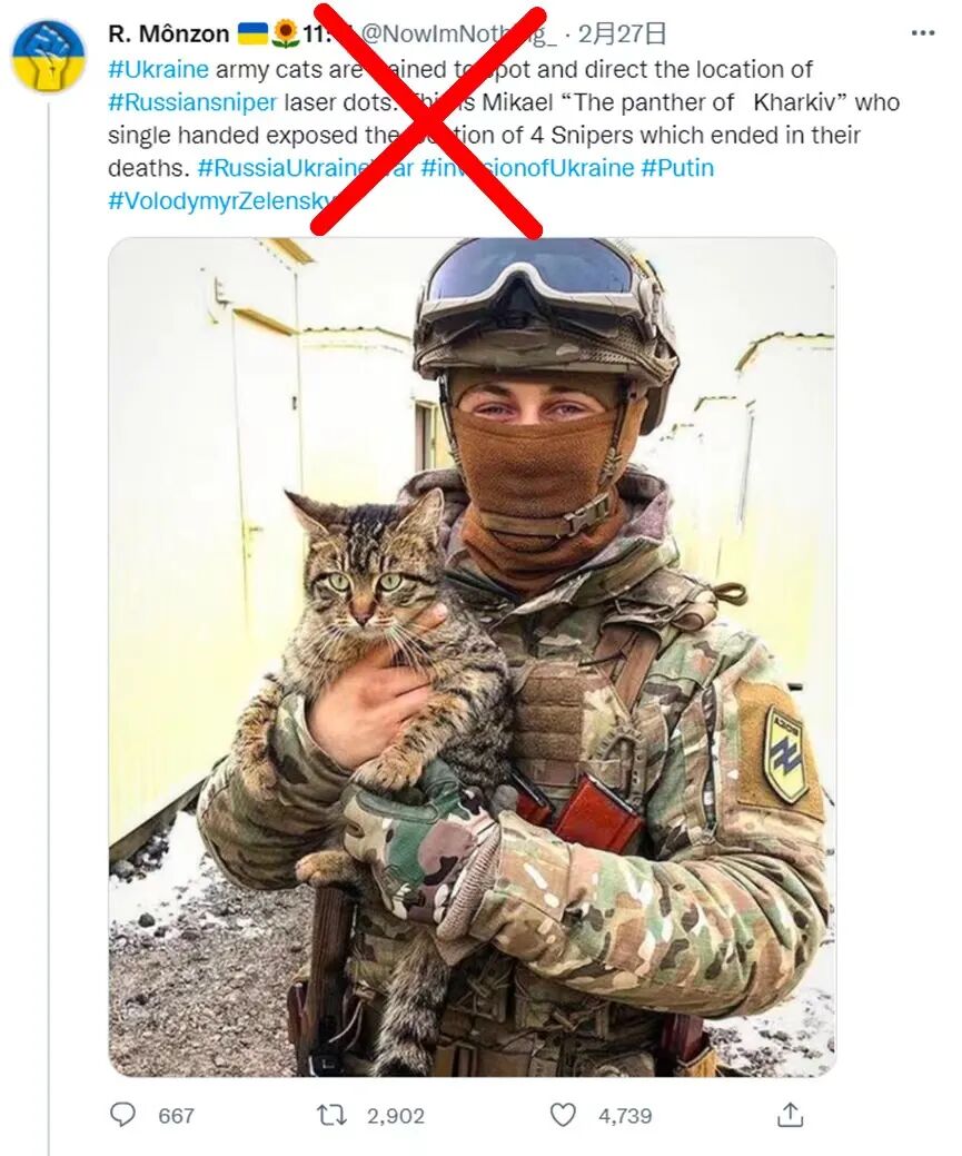 这种说法的源头来自推特用户@NowImNothing。这位网友解释,乌克兰军队豢养猫来追踪俄罗斯狙击手,而图中的这只名为“米卡埃尔”的军猫已经深入敌方,暴露4名俄狙击手的方位,导致他们战死。