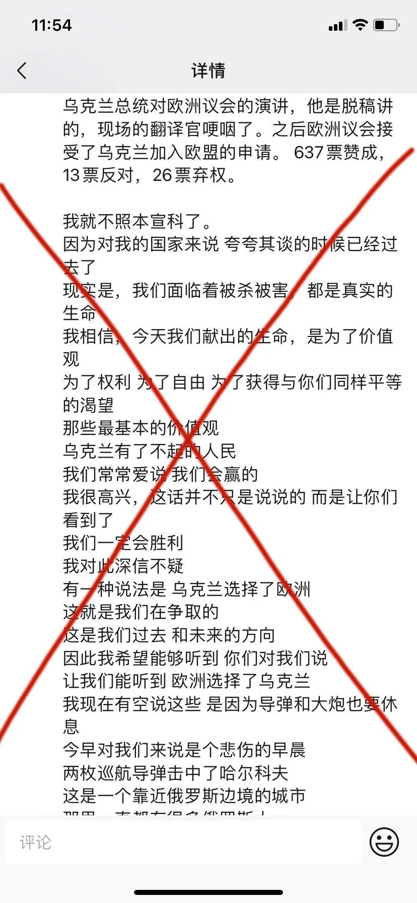 中文社交平台上流传的一则消息称,乌总统泽连斯基通过网络连线方式对欧洲议会发表演讲。网传消息宣称,“现场翻译官哽咽了”,演讲完毕,欧洲议会直接以637票赞成,13票反对,26票弃权的表决结果接受乌克兰加入欧盟的申请。