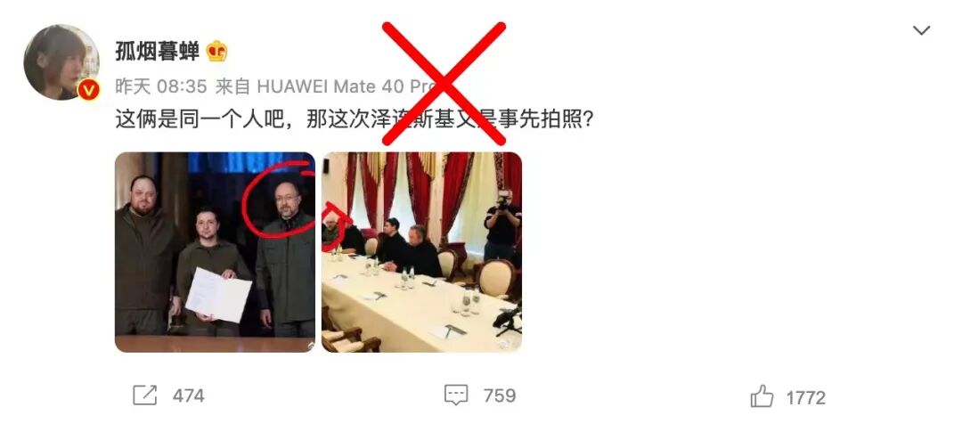 3月1日,有微博网友质疑,乌克兰总统泽连斯基签署申请加入欧盟文件的照片为提前拍摄,并随文上传了两张照片,各用红圈圈出了一名官员,从外形看两者疑为“同一人”。