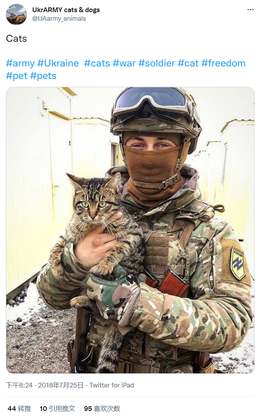 多年来,@UAarmy_animals一直坚持发布乌克兰军人与猫、狗等各种动物的合影。但是,他发布的这些动物并不都是军队饲养和训练的“军宠”。没有证据表明图中猫受到特殊军事训练。