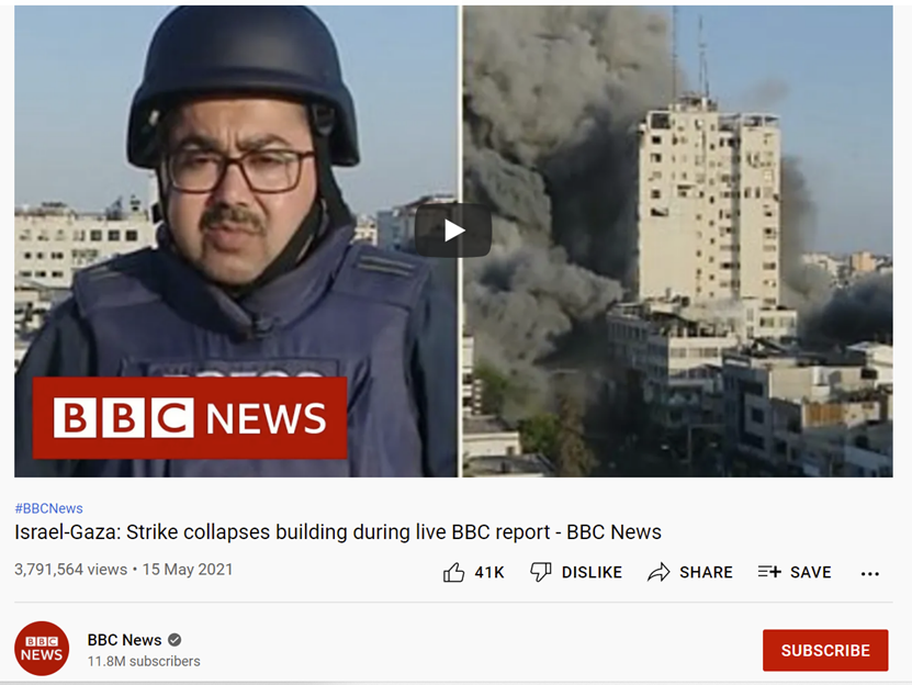 “BBC新闻”在YouTube上有一段直播视频录像,标题为“以色列-加沙:BBC直播报道时,(空中)袭击使建筑倒塌”。该视频中倒塌的建筑在色彩、外形和所处环境上均与被传作“乌克兰司令部”的建筑无异。据视频文字表述,视频中这座被摧毁建筑的名叫Al-Shorooq。因此,视频中倒塌的大楼并非乌克兰国防部。该建筑位于加沙地带,于去年5月被毁。