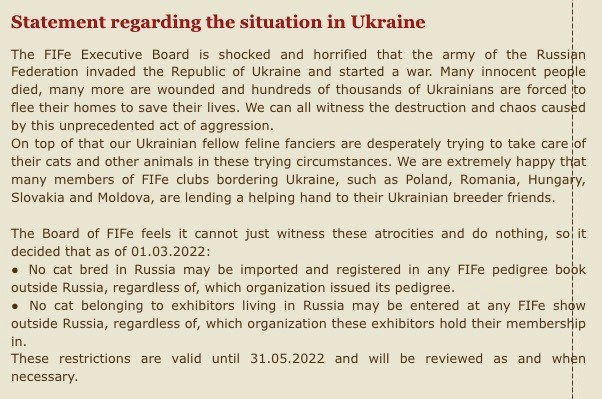 “国际爱猫联盟”发起制裁,在俄人士的猫不得参加其展览?消息属实。当地时间3月1日,“国际爱猫联盟”(FIFe)在其官网宣布对俄罗斯进行制裁。