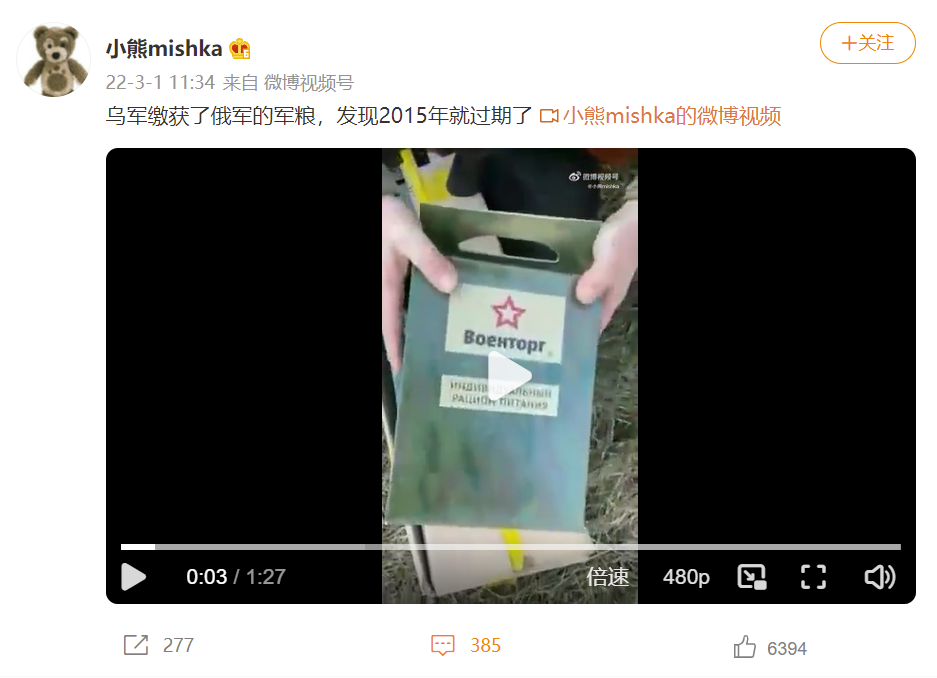 “明查”搜索发现,这一说法源自3月1日起在中外社交平台上广泛流传的一段视频——一位乌克兰士兵对着镜头展示了一种军绿色包装的干粮,声称“这是俄罗斯人的野外配给,到期日期为2015年,现在已经是2022年2月了。”