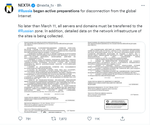 经查证,NEXTA最早于北京时间2022年3月7日发布消息,称俄罗斯开始为与世界互联网断开链接做积极准备。在3月11日前,所有服务器和网域将被迁移至俄罗斯本地。除此之外,各站点网络基础设施的详细数据正在被收集。NEXTA还配上了两张据称是俄罗斯政府文件的图片。