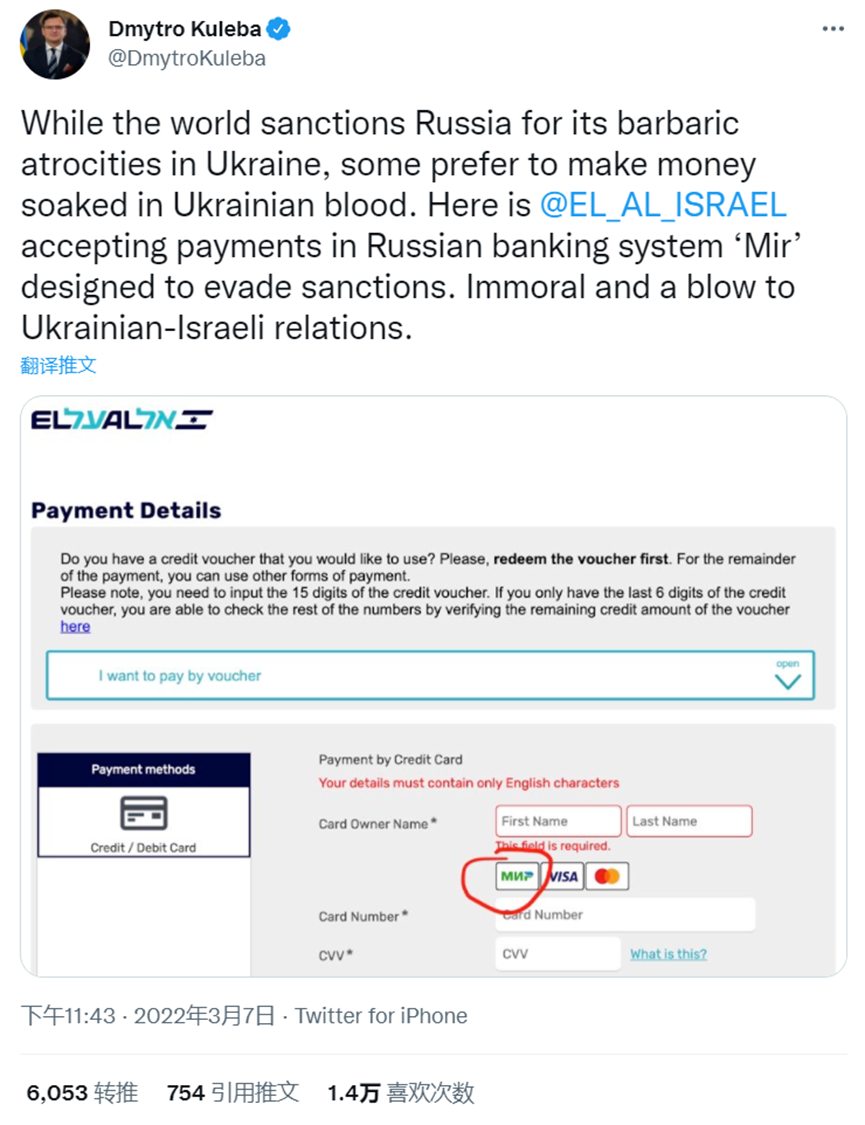 当地时间3月7日,乌克兰外交部长德米特里·库列巴(Dmytro Kuleba)在社交平台上“炮轰”以色列航空公司(El Al)继续接受俄罗斯银行支付系统“Mir”,帮助俄罗斯躲避制裁。配图为以色列航空的支付页面,图中信息显示,以航接受Mir、Visa,以及万事达(Mastercard)三种支付方式。