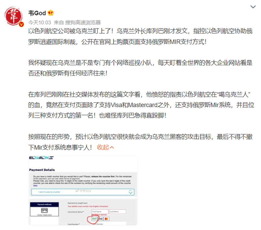3月8日,有微博网友发文表示,“以色列航空公司被乌克兰盯上了”,以航“支持俄罗斯Mir支付系统,并且位列支付方式的第一名”。