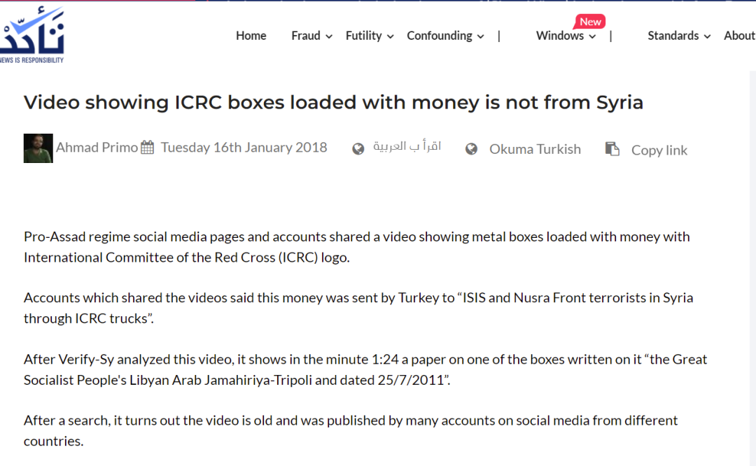 针对网传视频显示的红十字药箱及美元的来源,互联网上曾经传有多种说法,例如有YouTube用户称这是前刚果民主共和国总统卡比拉的财产,还有脸书用户称其为土耳其政府对叙利亚境内极端组织“伊斯兰国”(IS)和“征服沙姆阵线”的援助。来自叙利亚的国际新闻事实核查平台Verify Media Platform (Verify)在2018年对此视频进行了核查,指出视频中部分带有文字的画面,疑似显示了“大阿拉伯利比亚人民社会主义民众国 25/7/2011”的字样,可能与已故利比亚前领导人穆阿迈尔·卡扎菲有关。