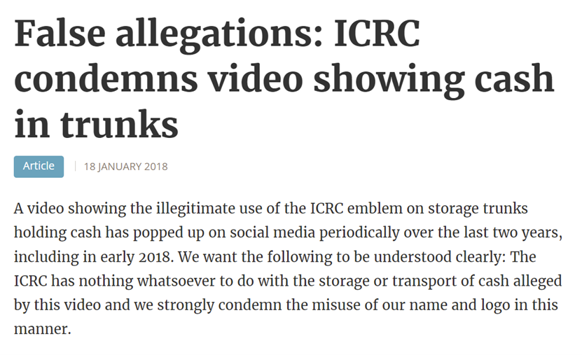 同一时间,国际红十字会也在其官网发表了严正声明,称“过去两年来,一段显示在存放现金的药箱上非法使用红十字会会徽的视频时不时地在社交媒体上出现……我们希望清楚地阐明:红十字委员会与这段录像所称的现金储存或运输没有任何关系,我们强烈谴责以这种方式滥用我们的名称和标志”。
