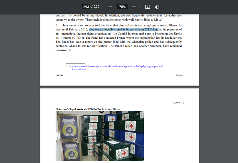 联合国安理会报告,至少到2016年2月,加纳首都阿克拉一家非营利组织的仓库里放有多只带有红十字会会徽的箱子。