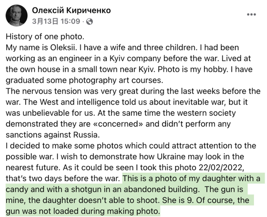 综上,网传女孩持枪的照片拍摄于2月22日俄罗斯对乌发动“特别军事行动”之前。这一“摆拍”并非政府行为,而是基辅当地的工程师、摄影爱好者阿列克谢·基里琴科的作品。基里琴科为他的女儿拍摄了这一组照片,目的是展现乌克兰在不久将来的命运、唤起民众对战争的关注,无法反应“乌克兰儿童扛枪上战场”。