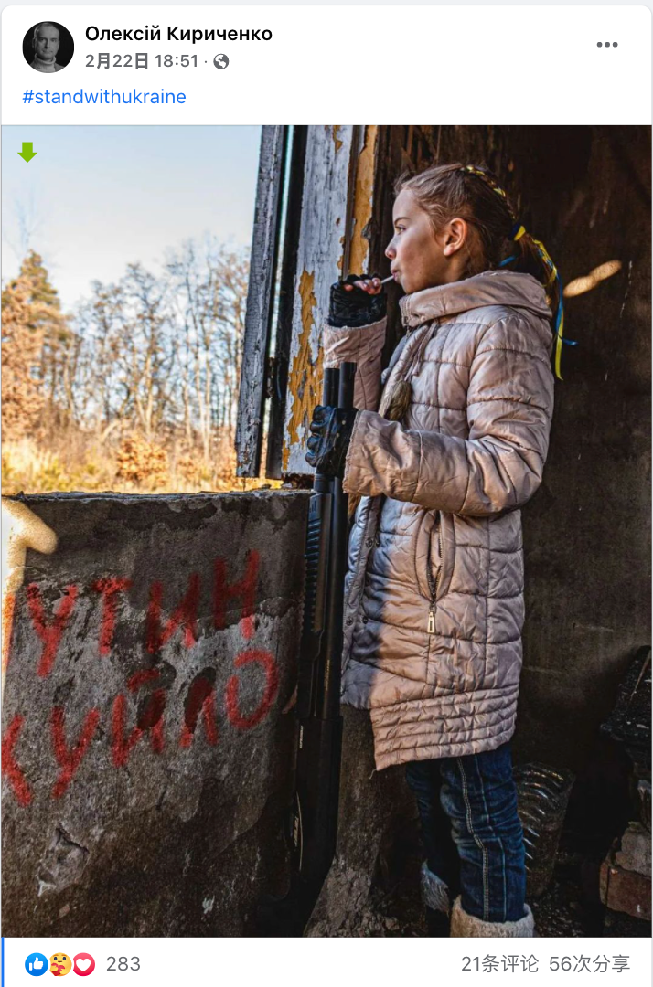 值得一提的是,2月22日,基里琴科还上传过一张风格相似的照片,画面中的女孩与网传图片中的女孩并非同一人。她身着银色羽绒服站在窗前,手中持有一柄形制一样的长柄步枪,同样衔着一支棒棒糖眺望远方。