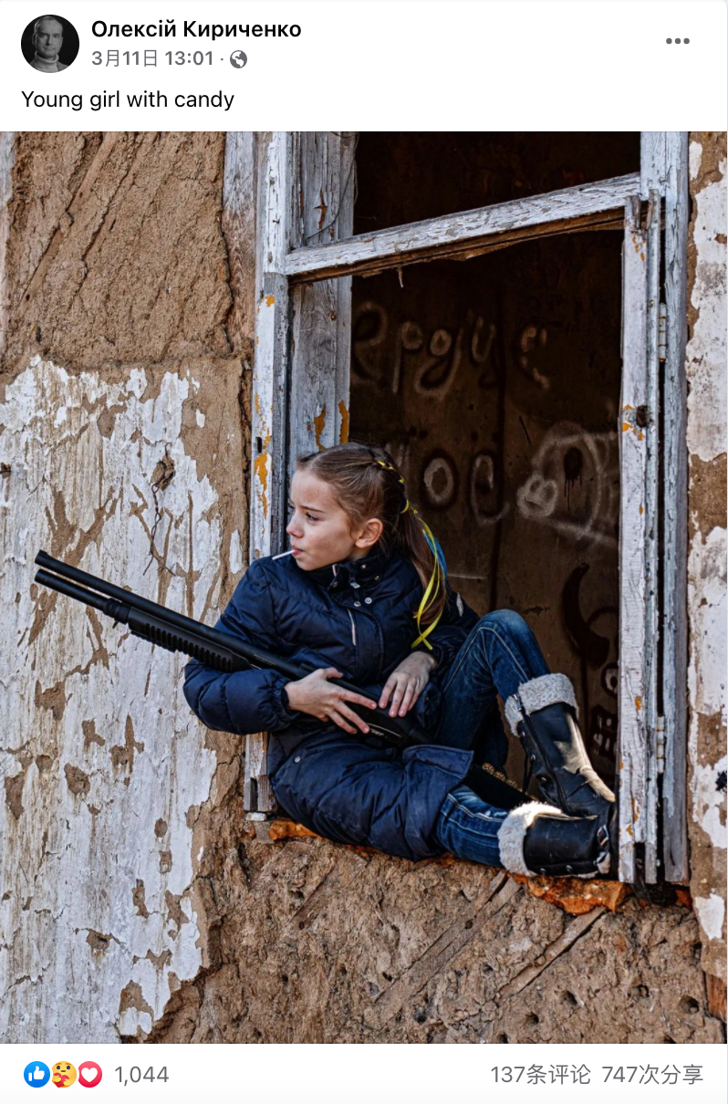 近日,有微博认证用户分享了一张有关近日俄乌战争的照片。图片中,一名女孩坐在窗沿上望向远方,怀中抱着一长柄步枪,口中衔着一根棒棒糖。