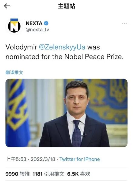 3月18日,有媒体在推特发布消息称,乌克兰总统泽连斯基被提名为2022年诺贝尔和平奖候选人。