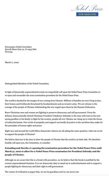 目前,没有权威信源显示泽连斯基已获得2022年度的诺贝尔和平奖提名。不过,据乌克兰国家通讯社ukrinform报道,日前有一群来自欧洲的政治家向挪威诺贝尔委员会呼吁,要求重开诺贝尔和平奖提名程序,并将乌克兰总统泽连斯基及乌克兰人民纳入2022年诺贝尔和平奖的候选人名单,为此他们在一家叫nobelprizeforukraine的网站上起草了一份公开信。
