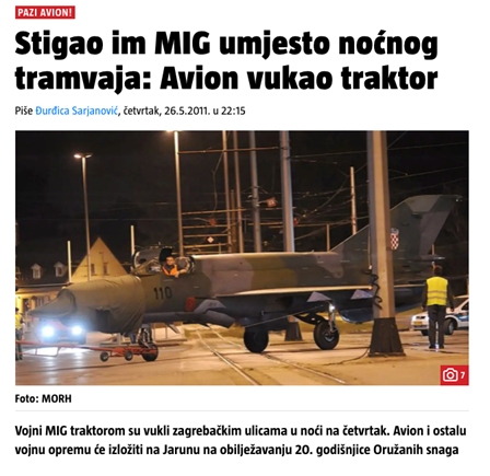 在谷歌中对上述图片进行反搜可知,图中事件的确发生于克罗地亚。2011年,正值克罗地亚武装部队成立20周年,首都萨格勒布的Jarun举行庆典。克罗迪亚当地媒体24sata.hr报道了这一事件。据称,一辆拖拉机拖着一架克军的米格战斗机穿过首都的大街,要将这架米格运往Jarun进行展示。故网传拖拉机“俘虏”俄军战斗机的图片具有误导性。