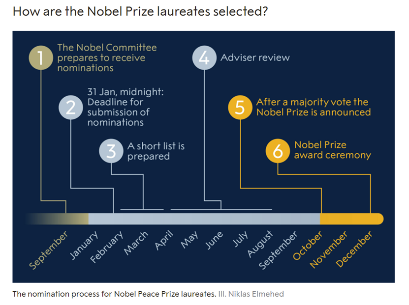 据诺奖官网信息,每年的诺奖和平奖的评选筹划准备工作始于前一年9月,来自社会科学、历史、哲学、法学、神学等领域的专家学者、各国政要、和平研究机构领导人、之前的诺奖得主、诺奖委员会成员及前成员等均有权向挪威诺贝尔委员会提名。提名的截止时间为当年1月31日,超过此限定日期收到的提名将被计入来年的奖项评选中。