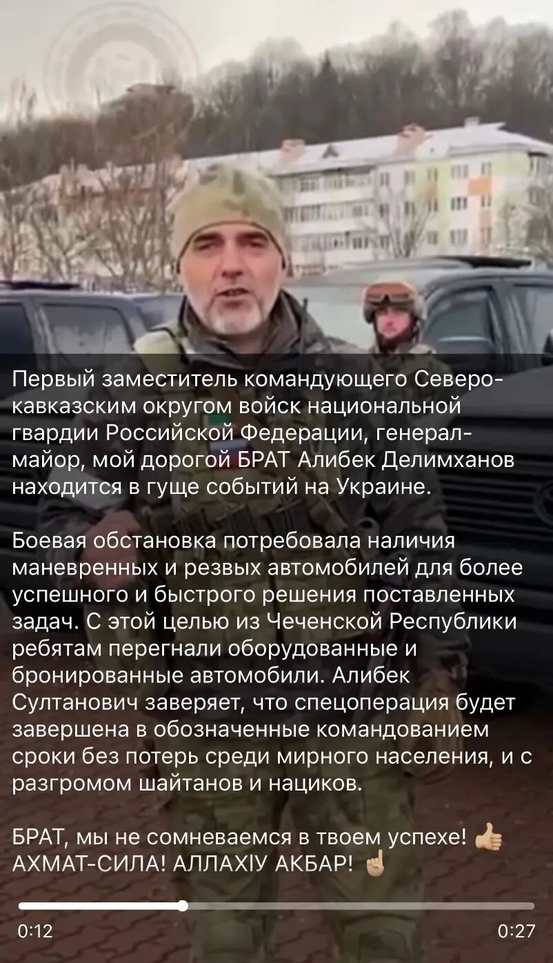 卡德罗夫称 “战斗情况需要机动车辆”,因此向前线的士兵运送了SUV。这条动态还写道,德利姆哈诺夫“正处于乌克兰最关键之处”,但是并没有透露德利姆哈诺夫所率领的士兵位于乌克兰的哪个城市。