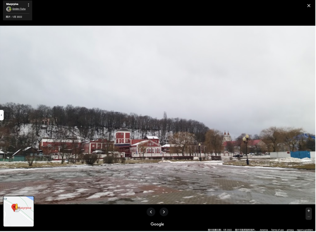 在谷歌地图上搜索“莫济尔皮瓦”,查看附近街景,发现一位名叫Dmitry Tichy的网友今年1月上传的照片比较如实且清晰地反映了该啤酒厂建筑外观的全景和周遭环境。例如,厂房背靠的山丘上的植被条件以及照片拍摄者所站立的Savieckaja大街另一侧的空地状况,都与网传视频拍摄地相似度极高。