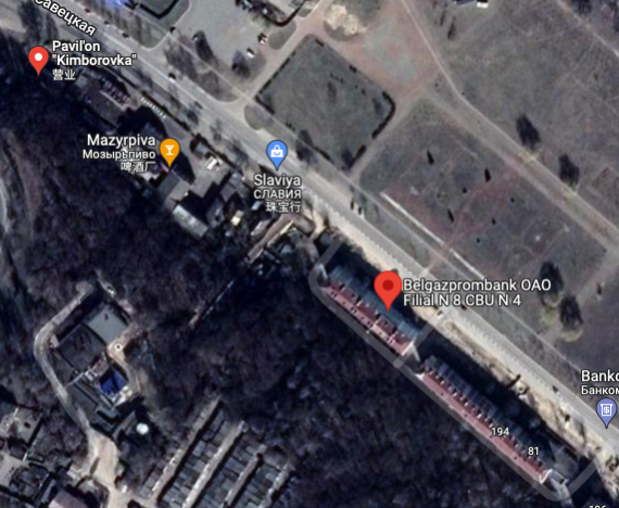 谷歌地图截图。莫济尔皮瓦与Belgazprom银行中间相隔一家珠宝行。