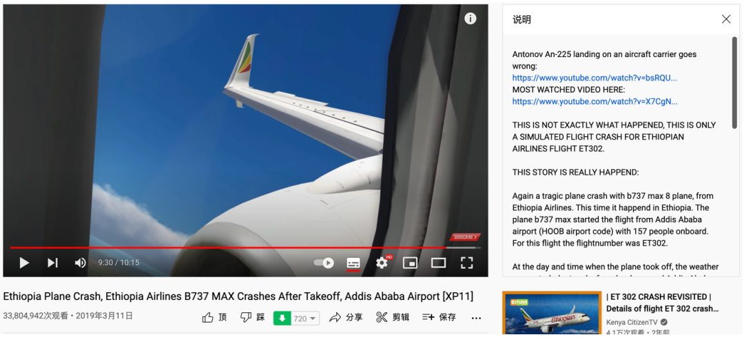 在描述栏内,这位博主特别说明,虽然埃航302客机坠毁的惨剧并非虚构,但是这一视频不能如实反映事故发生现场状况,而只是一种模拟。