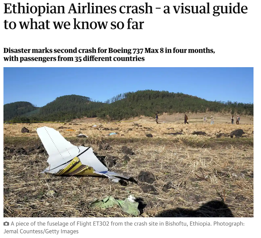 鉴于绿、黄、红为埃塞俄比亚国旗配色,在谷歌中围绕关键词“Ethiopian airlines crash”进行搜索,可知2019年3月,埃塞俄比亚航空一架波音737也曾发生重大坠毁事故。