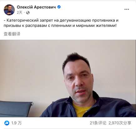 3月21日,乌克兰总统办公室顾问阿列斯托维奇在脸书上传了一段视频,就德鲁岑科的发言内容表态,称乌克兰明确禁止对敌人进行非人化处置。阿列斯托维奇在视频中说道:“我们不能超越《日内瓦公约》,该公约允许在战场上消灭敌人,但不允许我们嘲笑战俘,更不允许我们呼吁对平民、儿童和战俘进行报复。”