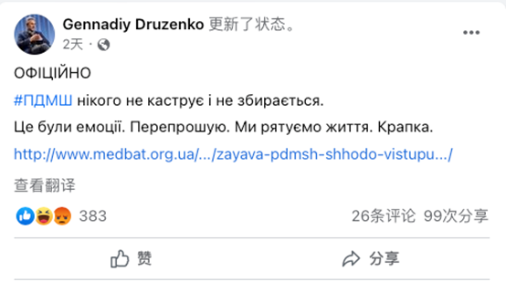 德鲁岑科所属组织Medbat在21日就此事回应称,德鲁岑科在电视台做的情绪性发言系德鲁岑科的个人意见,与Medbat无关。