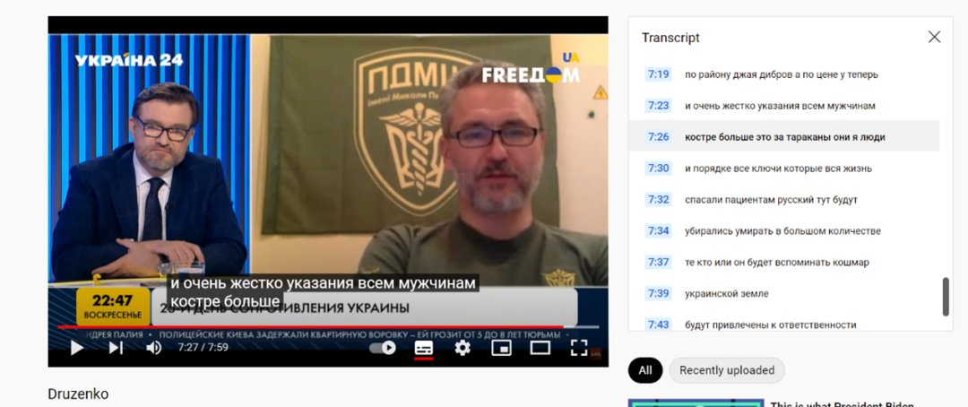 经核查,3月20日,“乌克兰24”对一位叫根纳季·德鲁岑科(Gennadiy Druzenko)的乌克兰医生兼乌东流动医院项目Medbat负责人进行了直播采访。在回答主持人提出的与英美国家记者采访德鲁岑科相关的问题时,德鲁岑科突然自白道:“一直以来我都是一个人道主义者,并且说如果一个人受伤了,他就不再是敌人,而是一个病人。但是我现在严令阉割所有(俄罗斯)人,因为他们是蟑螂,不是人。”