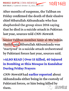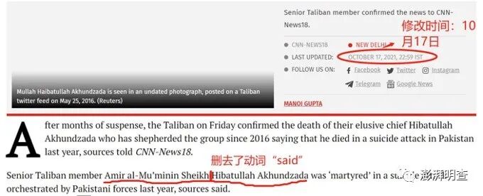 在最初的报道中,CNN-NEWS18援引了一个“塔利班成员Amir al-Mu’minin Sheikh”的话来传递阿洪扎达死亡的消息,而作为信源的“Amir al-Mu’minin Sheikh”并非人名,其中文意为“信士的长官,长老”,是一种称谓。