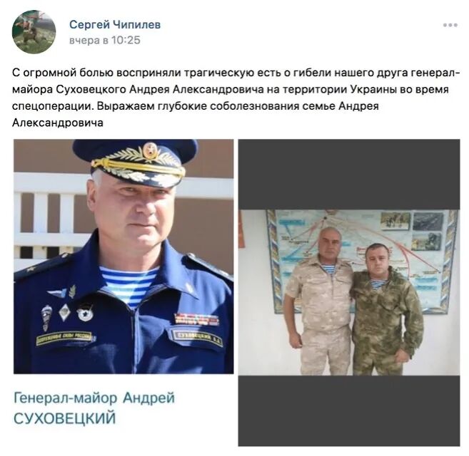 一张流传于Reddit等社交平台上的截图显示,3月3日,奇皮列夫曾在俄罗斯社交平台VK上发文称,“我们的朋友安德烈·苏霍维茨基将军在一次特别行动中在乌克兰领土上被杀,这是一件悲惨的事情。我们对安德烈一家表示深切的哀悼。” 该图文随后被删除。
