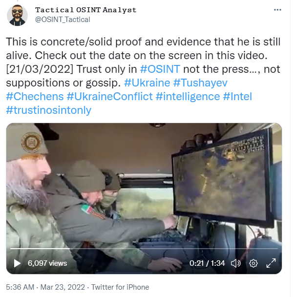 由于缺乏图像信息,卡德罗夫的通话无法直接证实“图沙耶夫”本人仍然存活。但近日来,推特上却流传有多段疑似图沙耶夫本人出镜的视频,用以证明“阵亡”一事并不可信。一段由推特用户@OSINT_Tactical发布于3月23日的视频显示了疑似图沙耶夫指挥部队作战的画面。视频第7至第9秒的画面显示,监控器上标记的时间为2022年3月21日。这意味着,如果视频画面真实可信,那么,图沙耶夫至少在3月21当日仍存活着。