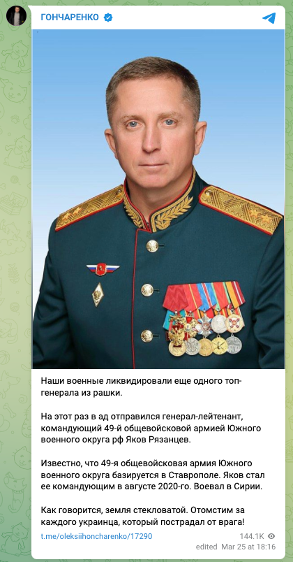 3月25日,泽连斯基总统办公室顾问阿列克谢·阿列斯托维奇(Oleksiy Arestovych)在Telegram上发布简报。他表示:“我们之前汇报过,现在能确认,我们的部队已经摧毁了俄罗斯联邦南部军区第49集团军司令、中将雅科夫·弗拉基米洛维奇·雷赞采夫(Yakov Vladimirovich Ryazantsev)。这件事发生在——你将会大笑——切尔诺贝夫卡(Chernobaevka)机场。”