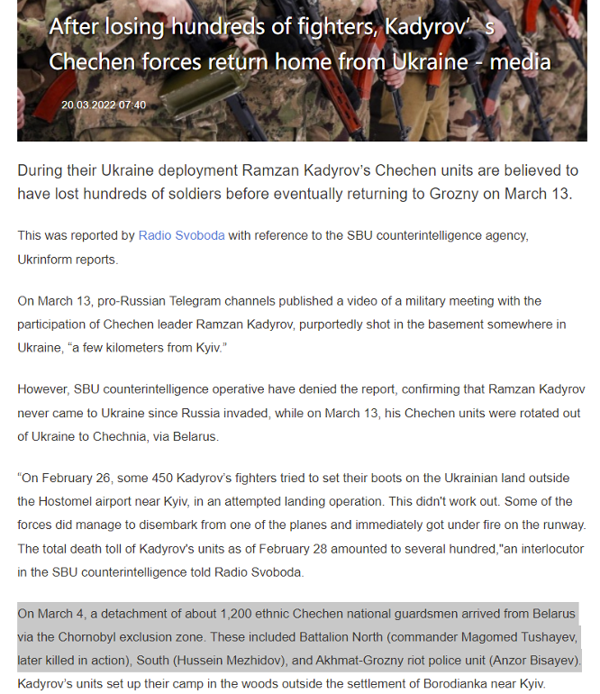 此外,乌通社近一月来发布的消息也有前后矛盾之处。继2月27日援引乌克兰拉达消息宣布“图沙耶夫已死”后,3月20日,该社又发消息称,3月4日当天,有约1200名车臣民族国民警卫队成员从白俄罗斯经切尔诺贝利禁区出发抵达(乌克兰),其中就包括图沙耶夫指挥的北营。报道中特别注明,图沙耶夫“在之后的行动中被杀”。此消息与之前的报道存在明显矛盾。