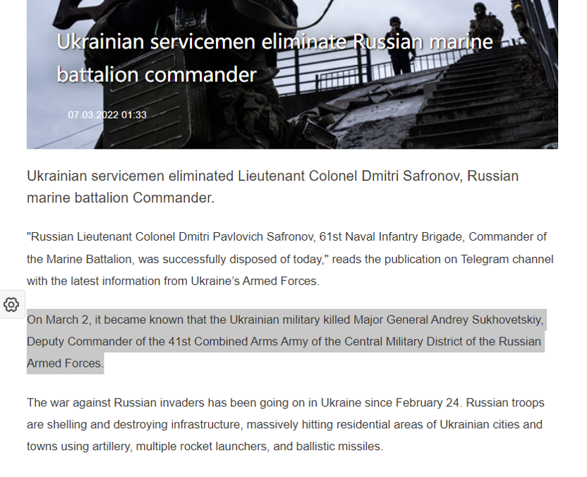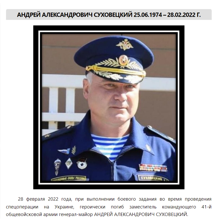 3月7日,乌通社发布消息称,乌军在当地时间3月2日击杀了俄罗斯第41集团军(41st Combined Arms Army)副司令、俄军少将安德烈·苏霍维茨基(Andrei Sukhovetsky)。