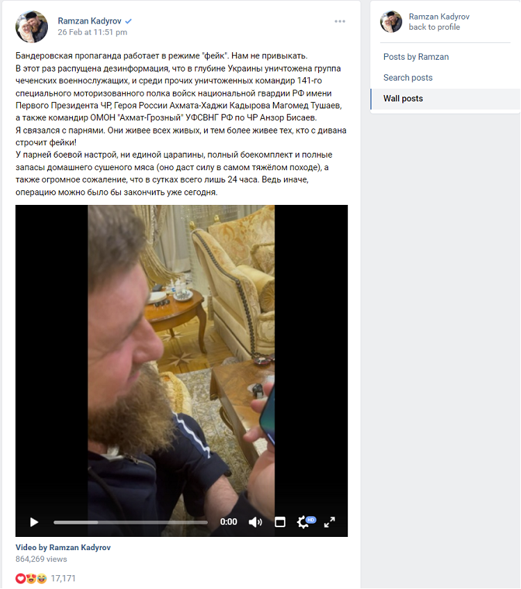 卡德罗夫在视频的配文中写道,“班德拉(编者注:二战期间‘乌克兰民族主义组织’领袖)的宣传正在‘假消息’模式下进行,我们对此早已习惯。这一次有谣言称,一群车臣士兵在乌克兰深处地带被歼灭,其中包括第141特种摩托化团指挥官穆罕默德·图沙耶夫和‘阿赫马特-格罗兹内’特警队指挥官阿佐尔·比萨耶夫。我联系了他们,他们比所有活着的人都更加有活力,比那些坐在沙发上敲出假消息的人更有活力。这些小伙子们斗志昂扬,没有一丝一毫的伤痕,他们弹药充足,自制的肉干也很充足(在最艰难的行动中肉干可以给予力量)。他们非常遗憾一天只有24小时,不然的话,今天就可以结束行动了。”