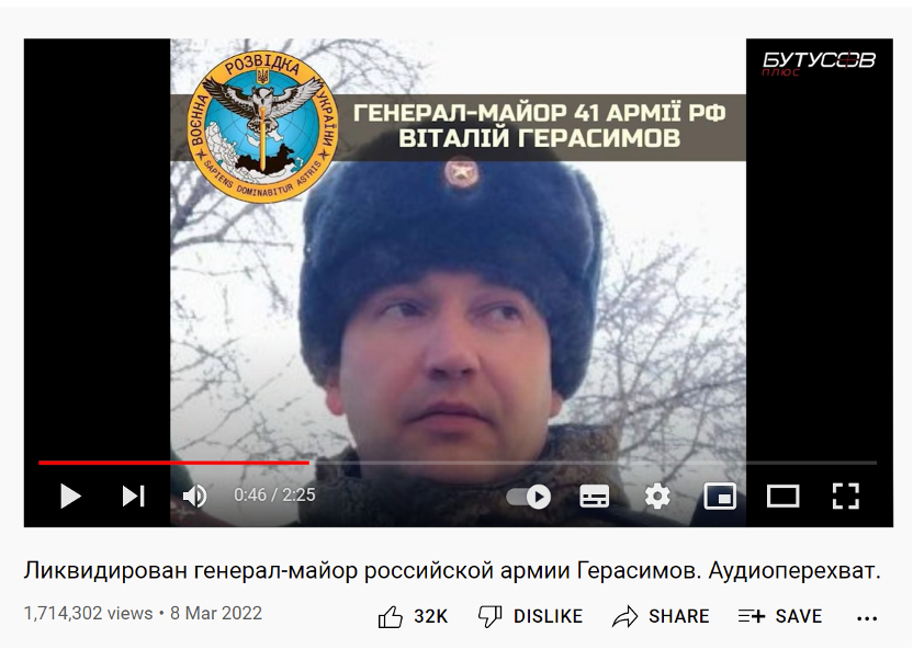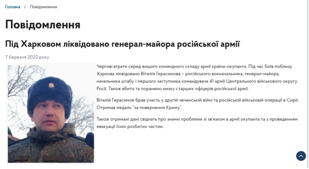 3月7日,乌克兰国防部网站发布公告:俄罗斯第41集团军(1st Combined Arms Army)参谋长、第一副司令维塔利·格拉西莫夫(Vitaly Gerasimov)少将在哈尔科夫附近地区的战斗中阵亡。该声明同时表示,俄罗斯军队的通信存在重大问题。