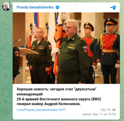 3月11日,乌克兰内政部长顾问、前国会议员安东·格拉申科(Anton Gerashenko)在其Telegram频道上披露,科列斯尼科夫已经阵亡。