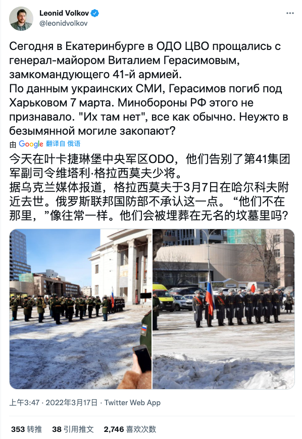 3月17日,俄未注册政党“未来俄罗斯”党魁阿列克谢·纳瓦利内(Alexei Navalny)的幕僚长列昂尼德·沃尔科夫(Leonid Volkov)在推特上透露,一群卫兵在俄罗斯东部城市叶卡捷琳堡为格拉西莫夫举行了告别仪式,并随附了两张告别仪式现场照片。