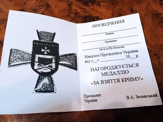 事实上,这些被称作为“占领克里米亚”特制的勋章和证书上存在多处疑点。首先,乌克兰官方(如乌克兰总统办公室)文件在提及克里米亚地区时,通常会将此地称作克里米亚自治共和国(Автономна Республіка Крим),或“AP Крим”。而网传图片中展示的盛放荣誉勋章的盒子内部及勋章下的荣誉证书上记载的该勋章名称为“За взяття Криму”, 其对于克里米亚地区的乌克兰语称呼与乌官方惯例不符。