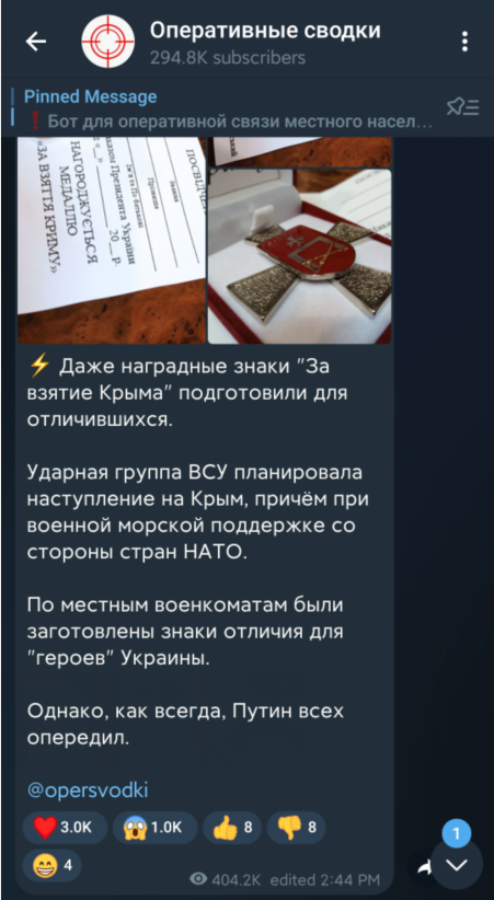 使用谷歌对消息中的图片进行反搜,结果发现,相关图片及说明曾于3月24日出现在一个叫“卡萨德上校”(Сolonelcassad)的telegram频道上,发布者称其消息来自另一个叫“军事行动报告”(Оперативные сводки)的telegram频道。经核查,“军事行动报告”在北京时间3月24日14时44分以频道名义发布了上文所示的3张表现“勋章”和“荣誉证书”的图片,并配文称这些“勋章”是俄军在乌克兰的军事登记和入伍办公室找到的,“乌军的突击部队将在北约国家的海军支持下袭击克里米亚。”