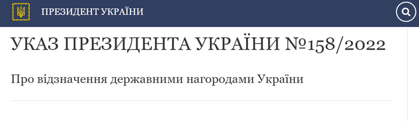 其次,这份荣誉证书正中有一句用乌克兰语写就的“Наказом Президента України”,意为“根据乌克兰总统的命令”,其中使用的“Наказом”一词在乌克兰的国家奖励体系中也不通用。在表达“总统令”的含义时,乌克兰官方更倾向于使用“Указ”(法令)一词,而乌克兰语“Наказом”一词对应的俄语单词“Приказом”,其实在俄罗斯的国家奖励体系中更为常见。