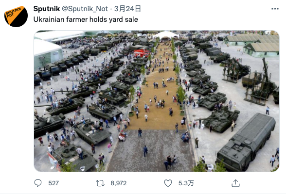 经查证,该消息由“卫星”(Sputnik)发布。截至3月29日,此推文已获得5.3万点赞。但是此卫星却并非俄罗斯政府下辖的卫星通讯社,而是一个戏仿账号。