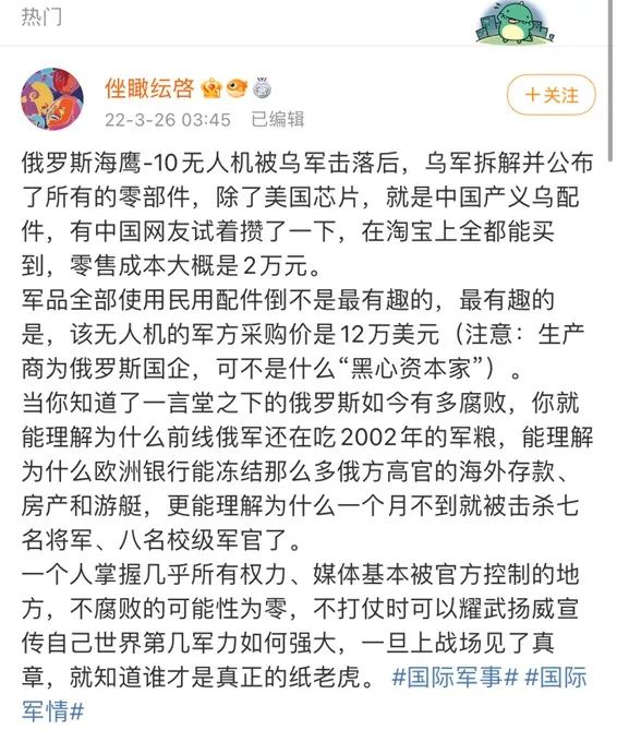 俄乌冲突已持续一月有余。近日,微博上有消息称,俄罗斯海鹰-10无人机被乌克兰军方击落后,乌军拆解并公布了该无人机的所有零部件,除美产芯片以外,其它配件均为“中国产义乌配件”。