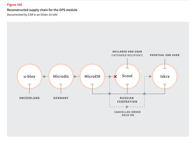 CAR通过追查发现,u-blox曾经将这种模块卖给了德国一家叫Microdis的电子经销商,后者又在2012年6月将该物品出口给了其合作伙伴——俄罗斯大型电子元件经销商MicroEM。MocroEM公司申报的该模块的最终客户是俄罗斯一家民用GPS跟踪器生产商Scout,但该订单后来被取消,这些模块又被卖给了俄罗斯的自动收银机生产商Iskra和某个不知名的第三方。