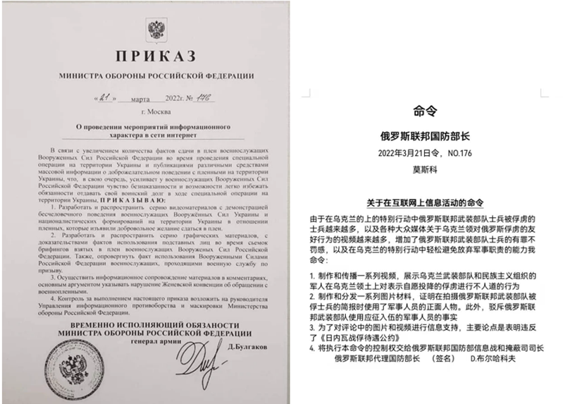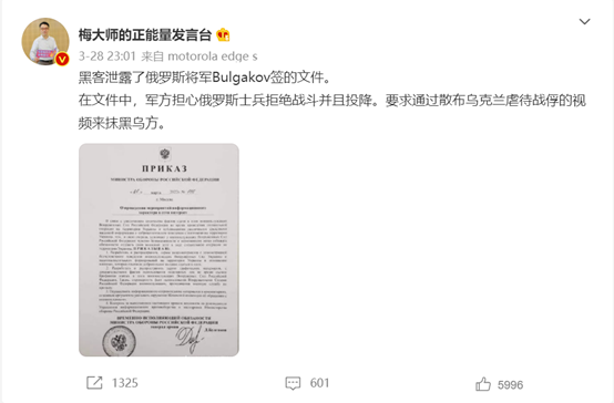 近日,微博、推特上广泛流传一张带有签名的文件截图。相关消息称:“黑客泄露了俄罗斯将军Bulgakov签的文件。在文件中,军方担心俄罗斯士兵拒绝战斗并且投降。要求通过散布乌克兰虐待战俘的视频来抹黑乌方。”
