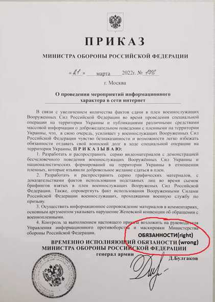 除上述疑点之外,还有不少熟悉俄语的推特用户指出,“匿名者”发布文件下方用黑色加粗大写字母书写的文字部分显示有单词拼写错误。文件打印的“ОБЯЗАНОСТИ”(责任)一词的正确俄文拼法为“ОБЯЗАННОСТИ”,应带有两个“H”字母。查询俄文词典可知,“обязаннocти”是俄语单词“обязанный”的演化,原词使用的双“H”词素被保留至“обязаннocти”中,成为一种惯例。考虑到这是一份来自俄罗斯国防部的正式文件,此类单词拼写错误似不应在该文件中出现。