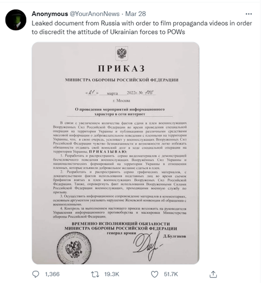 经核查,“匿名者”在推特上注册有名为@YourAnonNews的账号。北京时间3月28日下午8时41分,该账号发布消息称:“来自俄罗斯的泄露文件下令拍摄宣传视频以抹黑乌军对待战俘的态度。”随文附上的正是网传带有签名的文件图片。