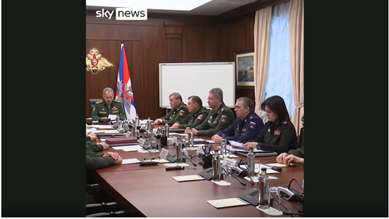俄国防部发布的视频截图,坐在桌子一端靠近旗帜的即谢尔盖·绍伊古。视频来源:天空新闻。